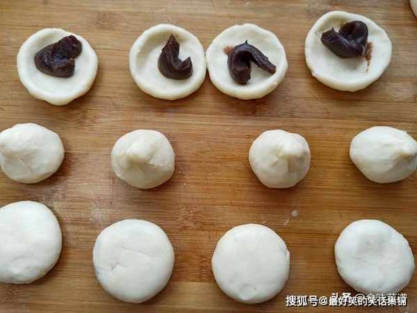 4、用手按扁捏成面皮,包入馅料,封口处捏拢收紧,轻轻按压成小饼的样子,注意不要太用力。