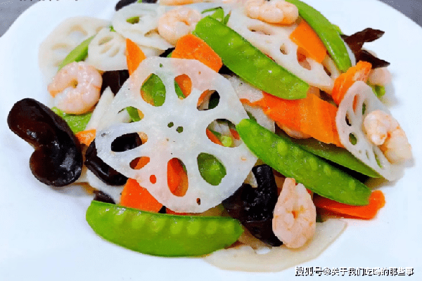 准备荷兰豆、藕片、虾仁、木耳、胡萝卜、蒜瓣、食盐、食用油、鸡精、香油。