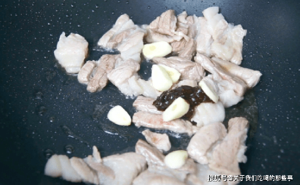 2、锅里倒入适量油,放入五花肉小火煸炒出油,变色后放入蒜片爆香,加入一勺豆瓣酱炒出红油,淋入适量料酒去腥,倒入腐竹、木耳翻炒2分钟。