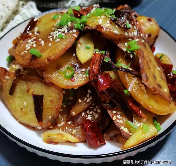 2、锅里重新加油,小火放入蒜瓣、干辣椒爆香,加一勺豆瓣酱炒出红油,倒入洋葱丝大火翻炒至断生,倒入土豆片翻炒均匀,加入生抽、食盐、白糖调味,撒上熟白芝麻、葱花,炒匀后即可出锅装盘。