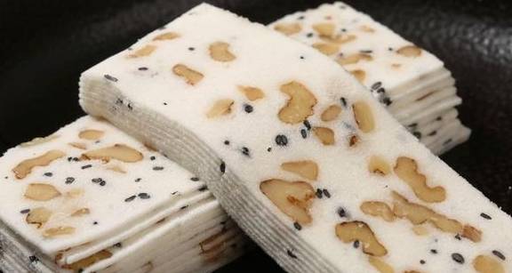 云片糕相信大家不会陌生,也是中华的传统糕点之一了。云片糕香甜软糯,很适合给长辈作为茶点食用。而核桃仁和芝麻的加入,让云片糕的口感和营养更为丰富。核桃有健脑的作用,而核桃云片糕对于长辈们来说是很友好的年货零食。