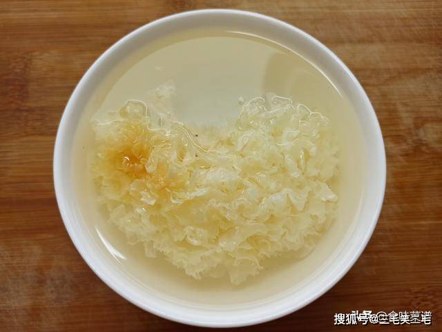 第一步:准备适量的银耳,择成小朵的形状,提前用温水泡软泡发,银耳富有天然的植物性胶质,具有滋阴,补肺益气的作用,可以长期食用。