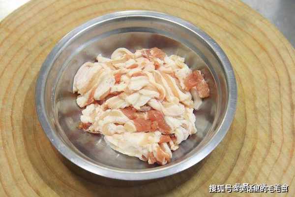 1.首先五花肉一块,用刀背拍一拍把五花肉拍松,切成薄片,把肉拍松吃起来口感更好,生肉切不好的话,可以稍微煮一下,更好切一点,切好以后放在盆中备用。