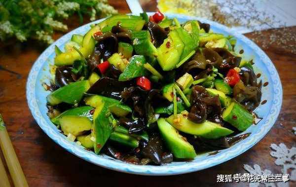 做它的时候,先提前把木耳泡发,然后清洗备用;再把黄瓜洗净,切掉头尾的部分,用刀背拍扁切小块儿。所有食材呈在一个大碗里,加点蒜末、小米辣,放适量生抽、盐、蚝油和醋,搅拌均匀装盘即可。