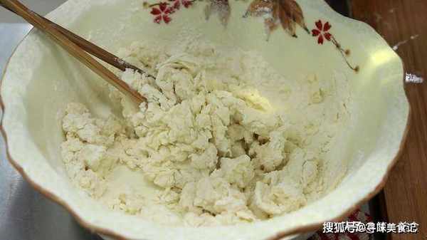 ,这个酱香饼要用半烫面,一半用开水烫面搅成面絮以后,一半用凉水和面,再倒入凉水,边倒边用筷子搅拌全部搅成面絮。