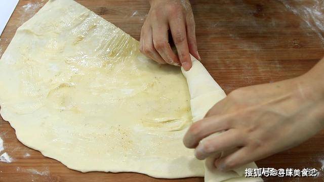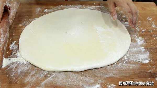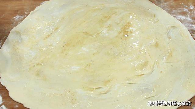 6.用擀面杖擀成一个大薄片,擀的时候要撒点面粉,用小刷子刷上一层油酥,油酥就是把面粉用热油烫出来的稠面糊。