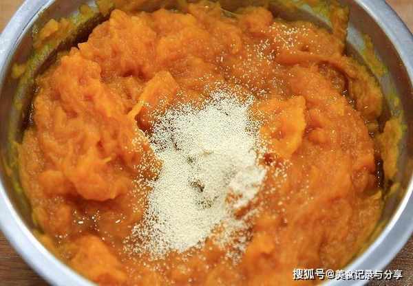 1.准备南瓜一块,切成小块,切好以后开大火上锅蒸,水开以后计时10分钟。10分钟以后南瓜已经软烂,把南瓜取出来放在盆中,加入白糖10克,增加南瓜的甜度,用勺子把南瓜按压成南瓜泥,等南瓜凉一凉以后,加入酵母3克搅拌均匀。