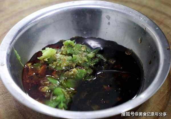 4.准备大蒜一把,放入蒜臼中捣碎,放入炒好的青椒,撒入少许食盐,把大蒜青椒碾成泥倒入盆中,加入食盐1克,生抽20克,陈醋5克,香油10克,搅拌均匀备用。
