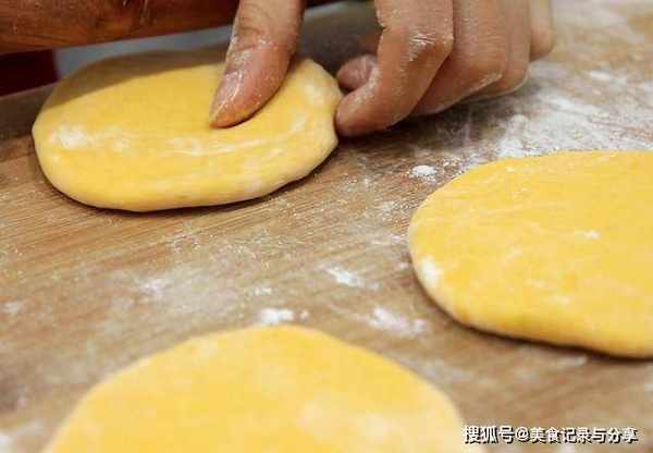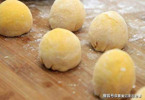 4.1个小时以后南瓜面团已经发酵好了,在案板上撒上一点面粉,把面团取出放在案板上揉光滑,搓成粗点的面剂子,再切成一个一个均等的面坯,拿起一个面坯揉成一个圆面,把所有的面团全部揉好,擀成一个圆形的面皮。