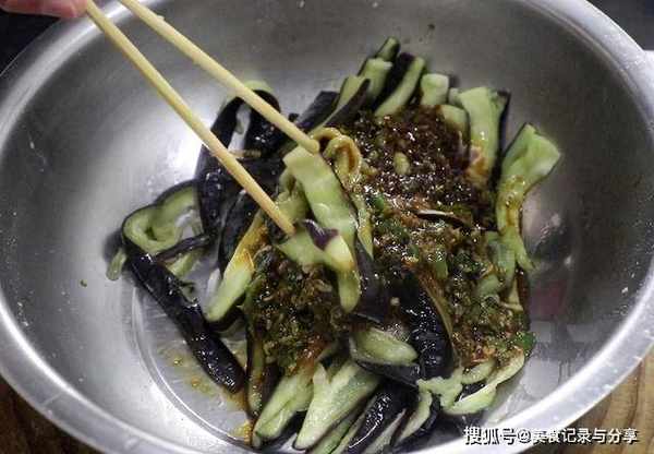 5.5分钟以后把茄子取出放在笊篱中,挤压出茄子中的水分,把茄子放入盆中,倒入调好的酱汁,颠盆拌匀后即可装盘。