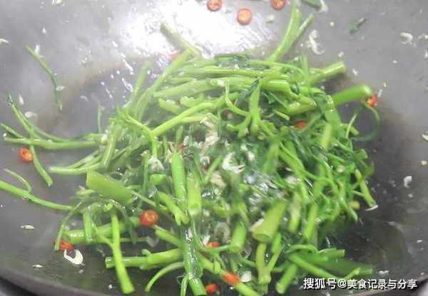 4.好了,一道口感清香的虾皮炒空心菜就做好了。