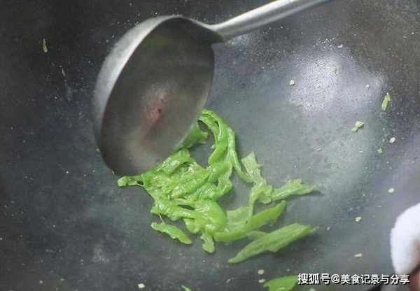 2.把锅烧热,不用放油,撒入少许食盐防止粘锅,把拍散的青椒放入锅中,用勺子把青椒敲碎,青椒炒软以后盛出备用。