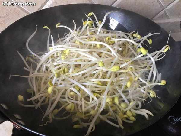 2、起锅烧油,下入葱白、蒜和辣椒,翻炒出香味,倒入豆芽,用锅铲从下往上铲,边铲边抖,让豆芽散开,均匀受热。翻炒2分钟。
