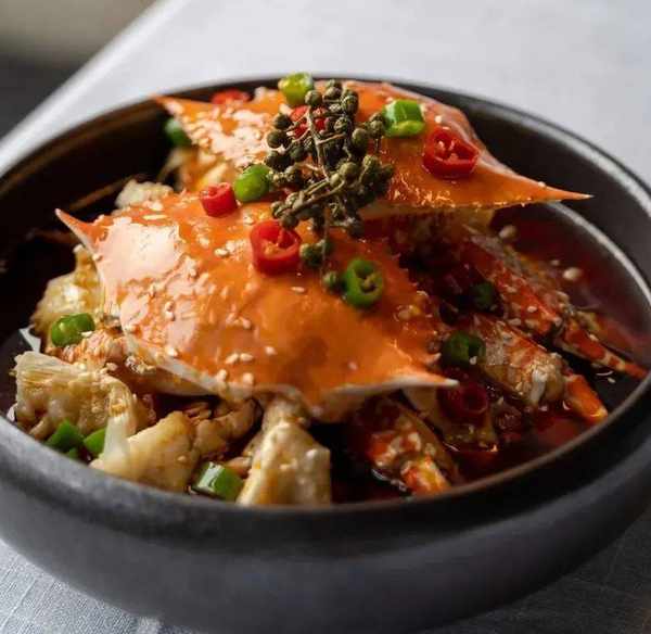 ※香辣蟹是一道四川省经典的传统名菜。精选鲜活梭子蟹。蟹肉色洁白,膏似凝脂。辅以四川汉源花椒、子弹头干辣椒加上自制香辣酱等制成的佳肴。香、辣、鲜、脆,味道鲜美,营养丰富!