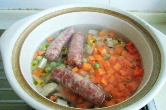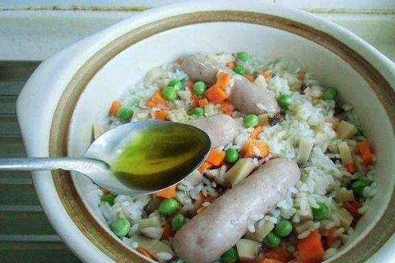 3、砂锅加大米和水,加香菇、胡萝卜、豌豆、香肠,加一勺植物油