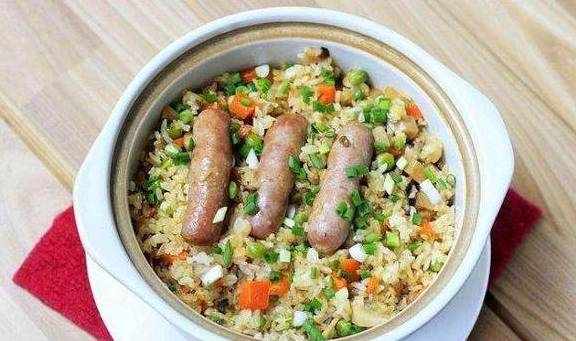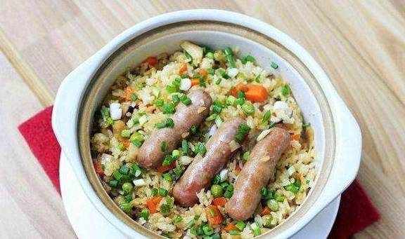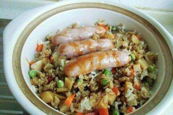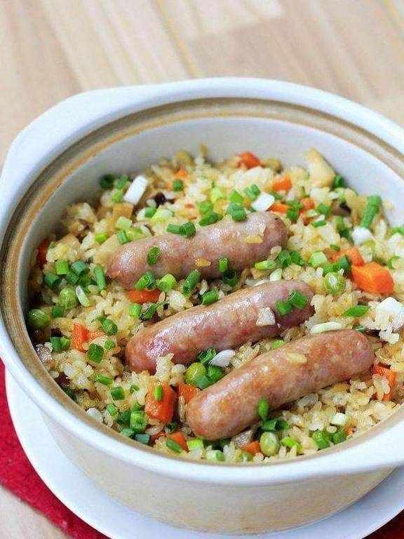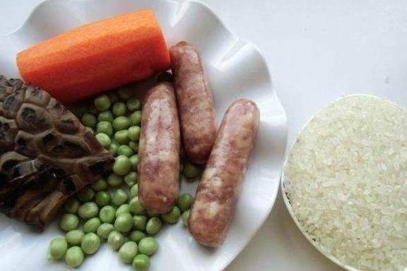 主料:大米、生香肠辅料:植物油、盐、生抽、蚝油,泡发香菇、胡萝卜、香葱、豌豆粒