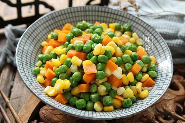 【食材】:豌豆 适量、蒜瓣 3瓣、白糖 1小勺、料酒 1勺、胡萝卜 适量、蚝油 2勺、玉米 适量、淀粉 1小勺