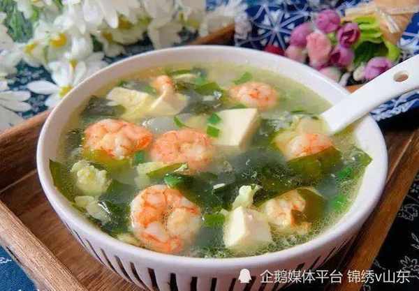【食材】:裙带菜、鲜虾、嫩豆腐、小葱、姜、蒜、食盐、胡椒粉