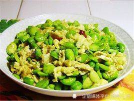 3、起锅烧热倒油,油热后放入鸡蛋液摊开,要凝固时滑散,鸡蛋推到锅的一边,倒入蚕豆瓣翻炒颜色变绿,再将鸡蛋一起混合翻炒;