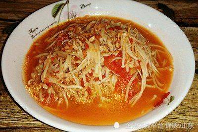 5、把金针菇放进去煮,大概煮上3分钟,好让金针菇入味,准备出锅之前,倒入鸡蛋液进去搅拌下,煮到凝固