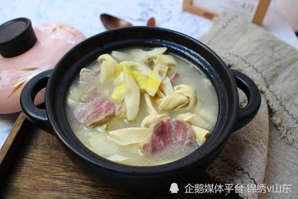 6. 待咸肉和腔骨煮到9分熟时,笋块和豆腐结入锅,慢炖20分钟,起锅撒香葱末。