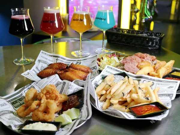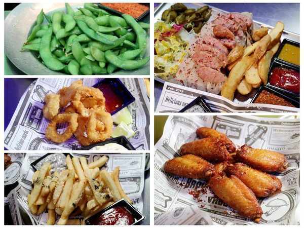 酥炸鱿鱼圈、烤鸡翅、德式香肠拼盘、黑松露脆浆薯条、冰毛豆,都是下酒好菜。