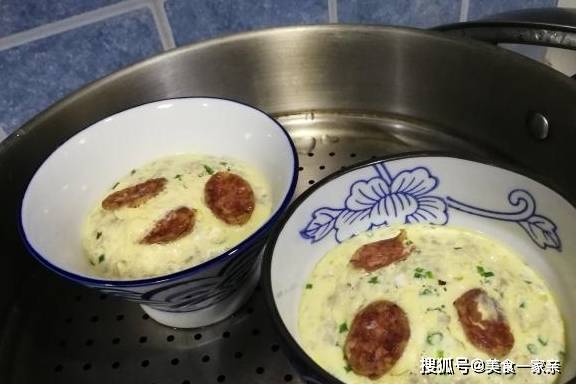 4.开大火,全程蒸25-30分钟,蒸到15分钟后,揭开盖子,把香肠放在蛋碗上。这样香肠就不会沉在蛋碗底下去了,提高成品菜的颜值,也方便把香肠蒸熟。