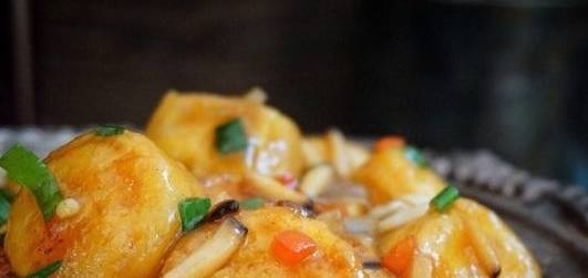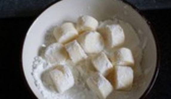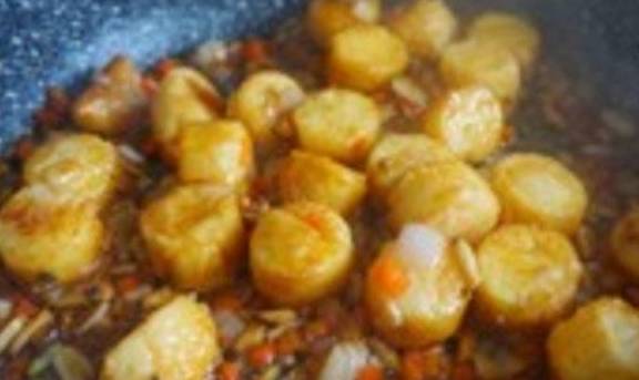 接着就是需要准备淀粉,把日本豆腐块均匀的裹上淀粉,然后就是放在油锅中炸成金黄色后捞出,然后就是准备洋葱,辣椒块还有香菇粒还有蒜末和葱花,接着就是把这些材料全部放在锅里面炒出香味。