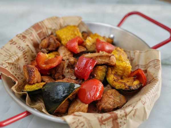 准备食材:鸡胸肉1块,小南瓜半个,水果玉米或者熟玉米半根,彩椒半个,生姜泡水少许,生抽1小勺,老抽半小勺,黑胡椒1小勺,盐半小勺,橄榄油1点点。