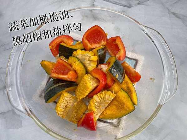 注意:烤蔬菜的时候不用垫油纸、铝箔纸啥的,蔬菜有水分,垫的纸上可能会积水,影响口感。
