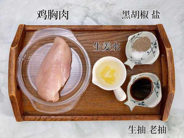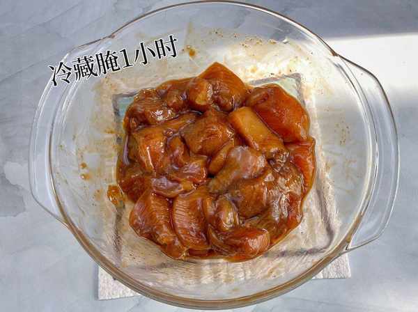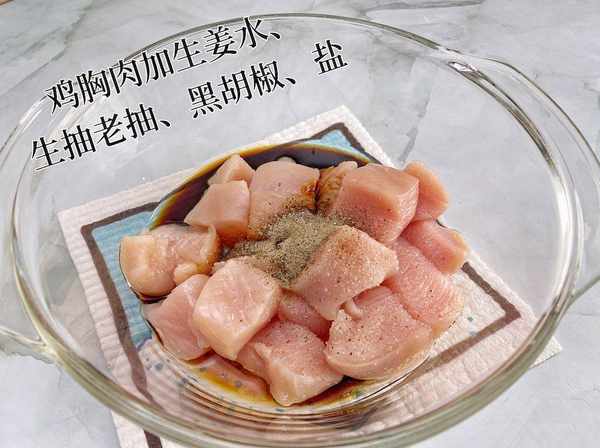 ① 鸡胸肉切成2厘米左右的小块,加少许生姜水、生抽、老抽、黑胡椒和盐,搅拌抓匀,冷藏腌1个小时。