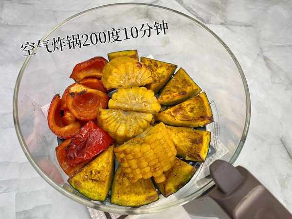 ③ 先把蔬菜放进空气炸锅,200℃烤10分钟,然后拿出来翻个面。