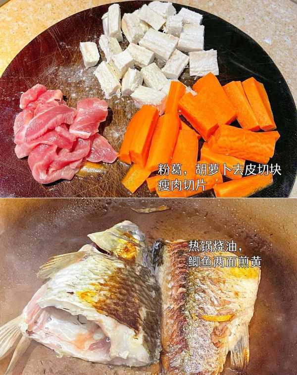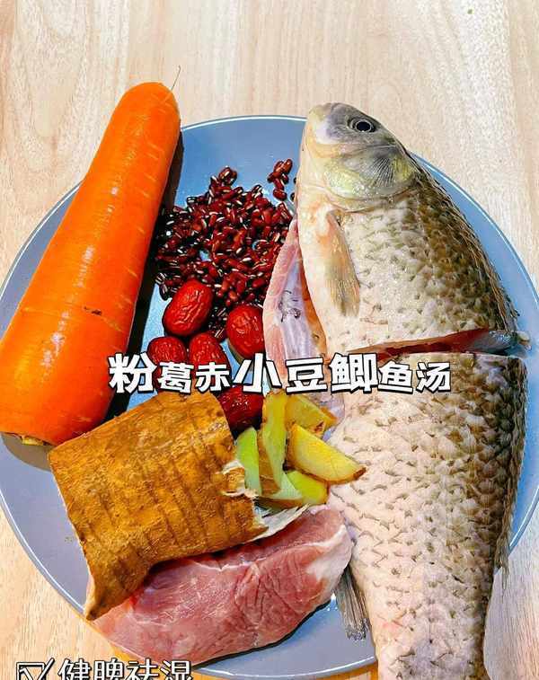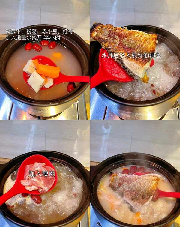 2.先将红豆、葛根、红萝卜、红枣煮30分钟。可以用中小火,然后加入鲫鱼和瘦肉一起煮60分钟左右。血沫在煮的过程中会被煮熟。这段时间一定要及时清除泡沫,这样嘌呤就少了。