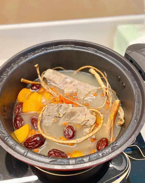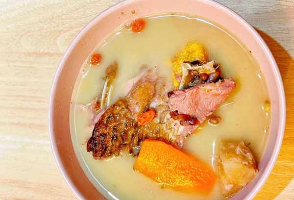 3.出锅前5分钟加入枸杞子和盐调味,出味后关火。此汤还可以加入红豆、芡实莲子、蜜枣等配料,味道和香气会更加浓郁。但如果不喜欢太多的味道,带走五指桃的甜味,就不建议加太多的料了。毕竟前两道汤也有红豆等成分。