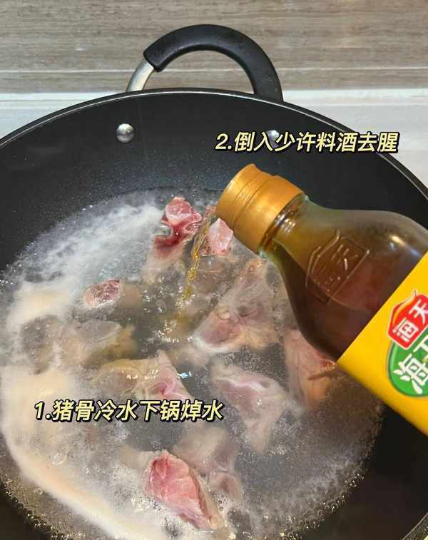 1.将半汤匙料酒倒入一锅冷水猪骨高汤中,用大火烧开,边煮边撇去浮沫,直至出现新的浮沫。
