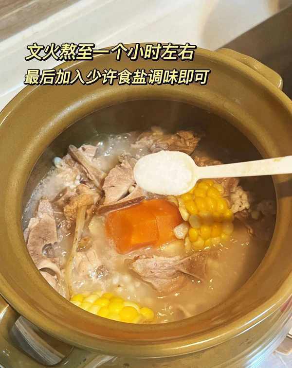 3、出锅前撒少许盐调味。薏米健脾胃消水肿。喝汤总比喝凉茶吃药好吧?担心高嘌呤的人可以将汤的煮制时间控制在40分钟以内。