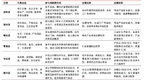 根据各参与者基因差异,行业参与者可以分为原料派、速冻派、餐饮派、零售派、专业派以及新兴派六大类,不同参与者在原材料掌控、工厂布局、渠道协同、产品研发、品牌力等方面各具优势,根据各自的核心优势入局预制菜行业。