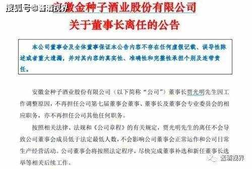 2月22日,安徽金种子酒业股份有限公司发布公告,公司董事长贾光明因工作调整原因,不再担任公司第七届董事会董事、董事长及董事会专业委员会的相应职务,亦不再担任公司其他任何职务。2020年2月,执掌金种子酒以后,贾光明在公司战略转型、创新发展、规范治理等方面实施一系列举措。在产品方面,包括推出金种子馥合香填补次高端产品的布局。贾光明离任金种子酒董事长后,金种子酒称,将尽快完成董事补选和新任董事长选举等相关后续工作。