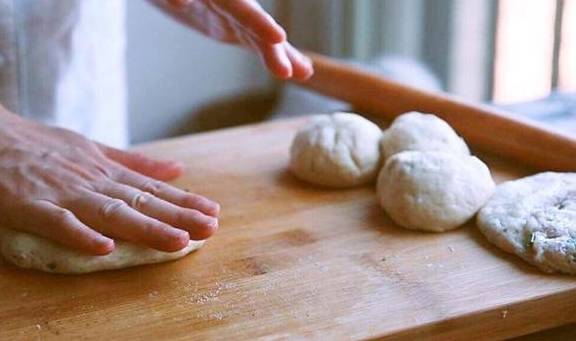 7.卷好的面团竖起来压扁,用手压成面饼。按照上面的做法,做好所有面饼。