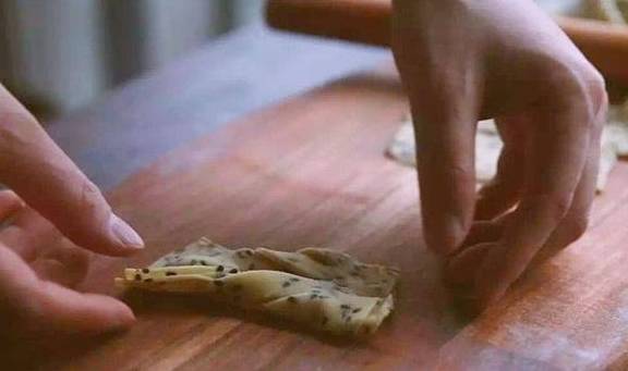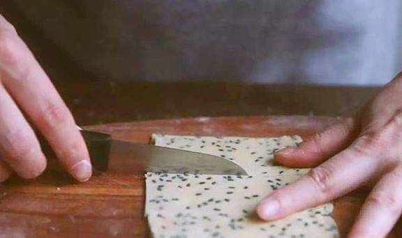 3.将面片整理成规矩的大长方形,再切成一个个小长方形,然后再将两片叠加在一起,形成双层长方形,最后中间切二刀(不要切断),面片从中间翻出,叠成一个麻花叶状。