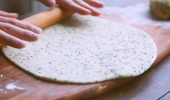 2.用保鲜膜密封,静置30分钟,让面团柔软一些方便擀。然后将面团擀成面片(尽可能的薄,越薄越酥脆)