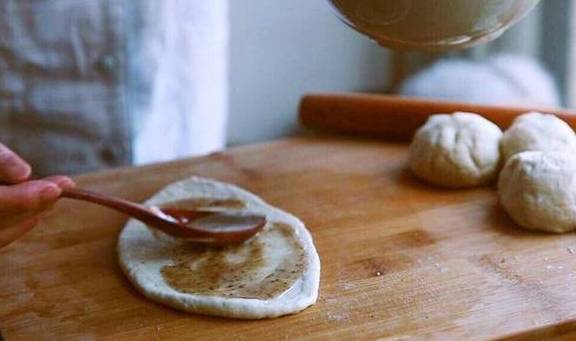 4.把发酵好的面,加入一点色拉油揉成均匀面团(这样更柔软细腻,做好的馅饼会更松软可口)面团均匀分成几份后,把面团擀成长条状抹上油酥。