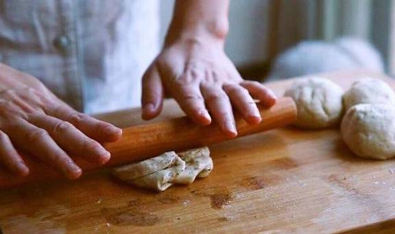 5.将抹好油酥面团从下至上卷起来。卷好的面团竖起来压扁,再次擀成长条状。