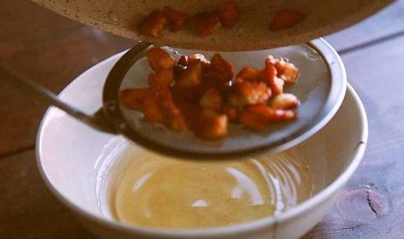 3.猪肥肉切丁,中火熬出猪油,在猪油中加面粉、食盐、胡椒粉、五香粉、花椒粉各少许,搅拌均匀成油酥。