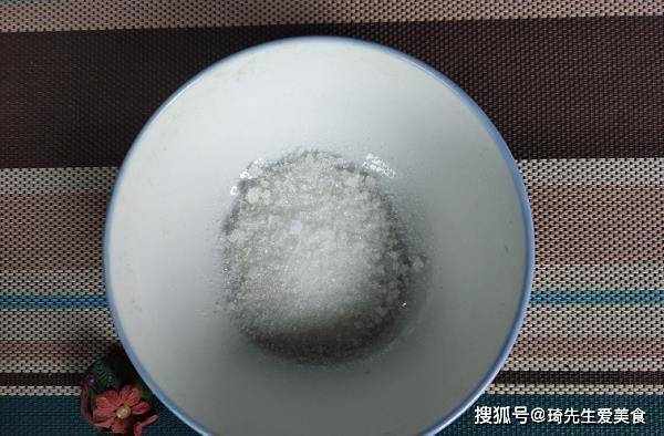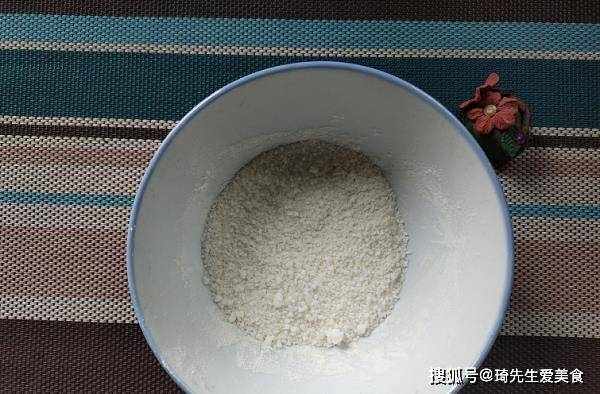 2、糖粒放到干燥的碗中,撒入少许的干面粉,然后用手抓匀,让面粉包裹住糖粒;这才是制作糖糕馅料的正确步骤,如果直接包入糖粒,不但吃的时候糖水会到处淌,如果热的时候直接咬下,可是会烫伤口腔的,这个小技巧可要注意。