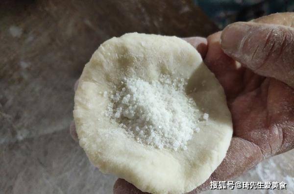 4、面团分切成大小适中的面剂,用手掌按压之后,采用擀面杖擀平,放入一小勺备好的糖馅,然后捏紧即可。