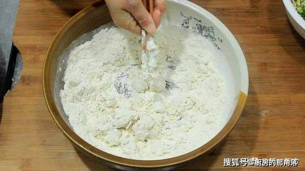 1.首先,我们在盆中加入面粉300克,把面粉分成两半,一半用80毫升的开水和面,另一半用80毫升的凉水和面,边倒边搅拌,把面絮揉成面团,静置饧面20分钟。
