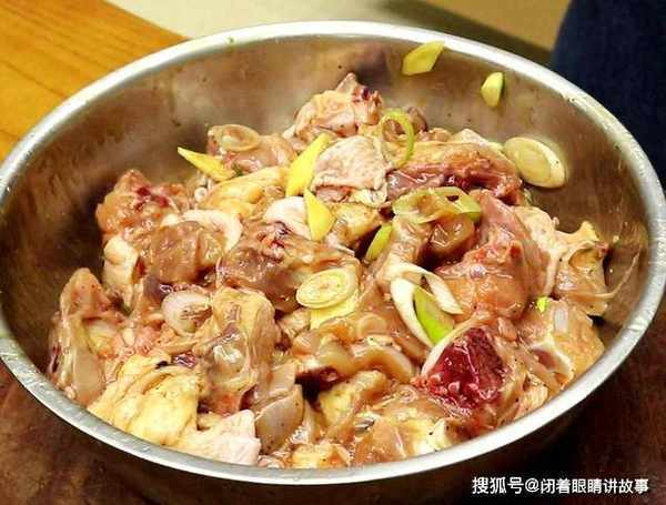 。捞出后,用凉水冲洗。鸡肉腌好以后,捡出其中佐料,然后撒入淀粉,给鸡肉均匀裹上。