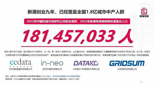 中科网联、尼洱、数字100、国双四家权威调研机构的调研结果显示,2022年社区电梯视频媒体的广告触达率达92.1%,远高于商场、写字楼等其他户外广告点位。而在全国社区电梯视频媒体中,新潮传媒凭借47%的市占率、对1.8亿用户的有效触达,已成为中国社区流量重要入口。