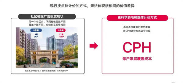 新潮传媒针对CPH是根据人群标签和地理位置进行划分的计费标准。品牌可以将广告精准投放给某一类人群或某一类家庭,并根据他们与品牌的契合度付费,让高净值客户和低净值客户形成价格阶梯。